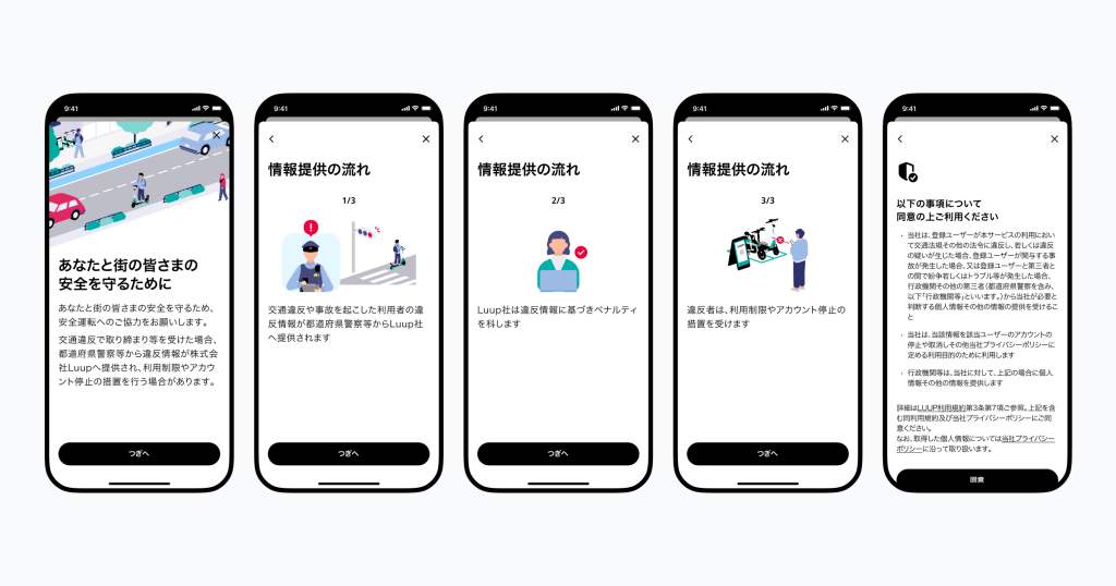 この変更により、Luupは利用者の皆様からの事前の明示的な同意に基づき、警察から受領した違反情報を用いて、違反した利用者のアカウント停止等を効果的に講ずることができるようになります。