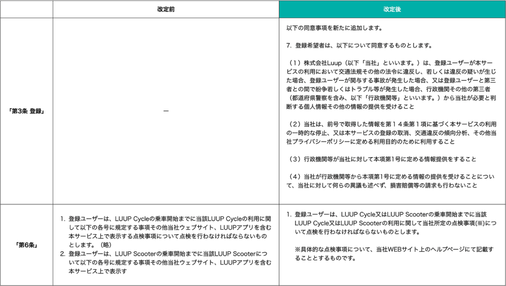 いつもLUUPをご利用いただきありがとうございます。このたび、LUUPの利用規約およびプライバシーポリシーの内容を一部改定することといたしました。本改定の主な内容により、都道府県警察からLuupに対して違反情報(違反の日時、場所、種別、利用車両の標識番号)を提供すること等に関して同意をしない限り、LUUPの特定小型原動機付自転車(電動キックボード等)を利用することができなくなります。Luupは利用者の皆様からの事前の同意に基づき、警察その他の第三者機関等から受領した交通違反等の情報を用いて、違反した利用者のアカウント停止等を効果的に講ずることができるようになります。また、事故等の発生の際に、当社から保険会社への情報提供を可能とすることで、トラブルの解決を促進します。なお、本改定は2025年11月7日(金)から適用されます。