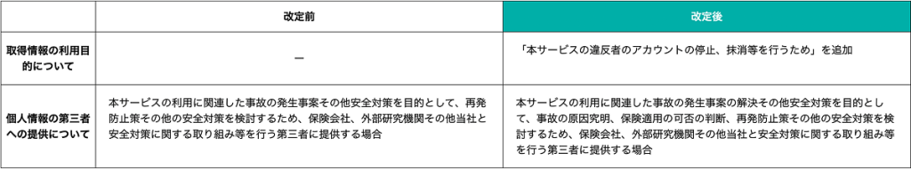 なお、第3条の改定は個人情報保護法(https://laws.e-gov.go.jp/law/415AC0000000057)、および関連するガイドライン(https://www.ppc.go.jp/files/pdf/240401_guidelines03.pdf)に基づいており、お客様のプライバシーに配慮し、限定された内容のみを受け取り、または提供するものです。交通ルールを遵守し、サービスを適切にご利用いただいている限り、お客様が何らかの制限を受けることはありませんので、ご安心ください。