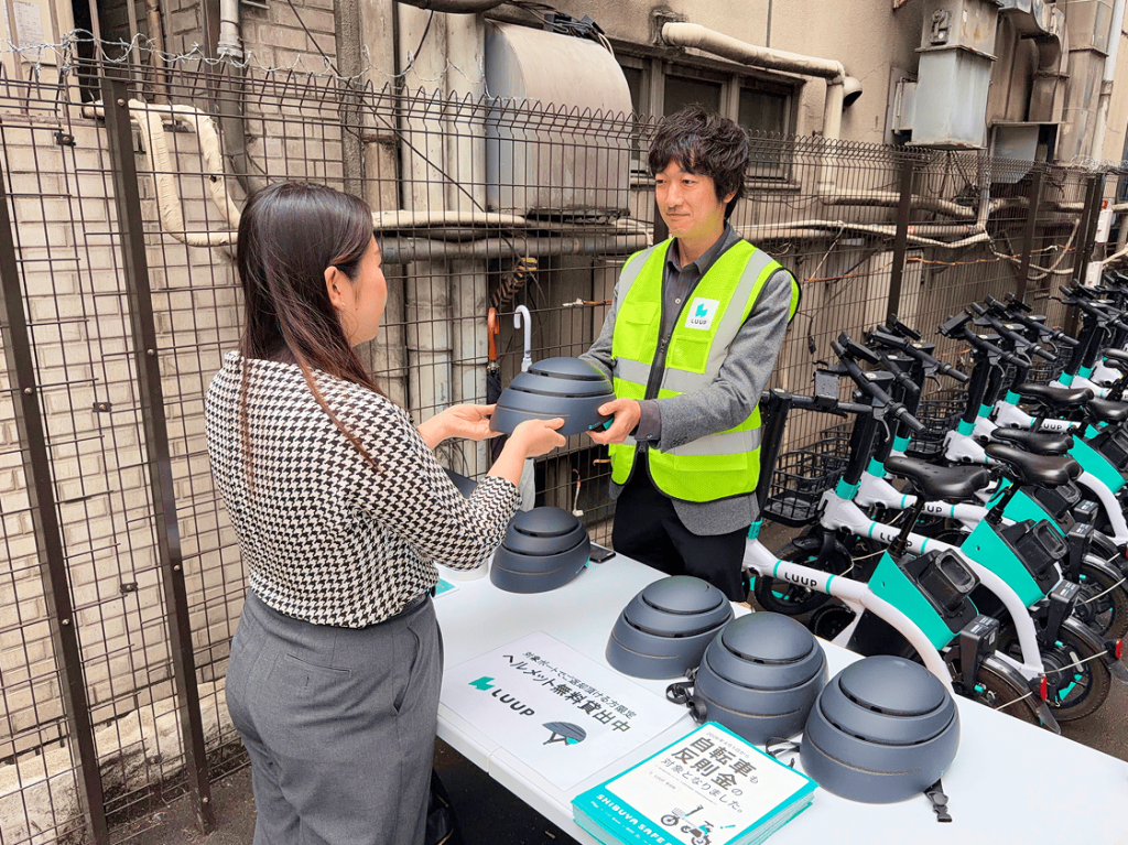 LUUPの電動アシスト自転車を配置したポートにて、スタッフが対面でオリジナルデザインのヘルメットの貸出を行いました。