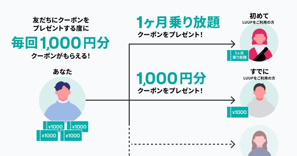 〜友だちを招待するたびに1,000円分クーポンをプレゼント!招待された方のうち、初めてご利用の場合は、1ヶ月間、30分のライドが何度でも無料に~